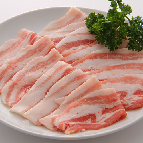 梅山豚肉の中で特に脂の旨味を感じられるバラ肉を2ミリ厚にスライスしました。